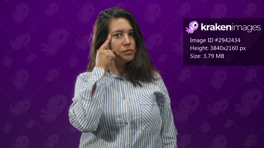 Woman in striped shirt touching temple with finger and pointing toward camera in studio with purple backdrop; thinking focus command.
