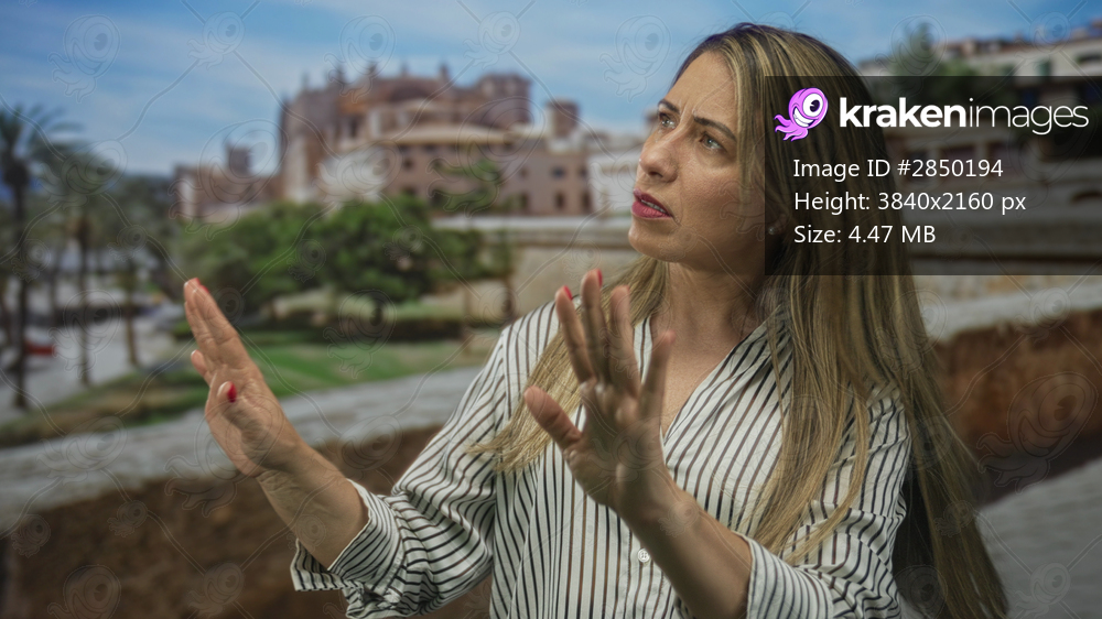 Woman in striped shirt turns head upward and raises hands in street of old town to signal stop; calm.