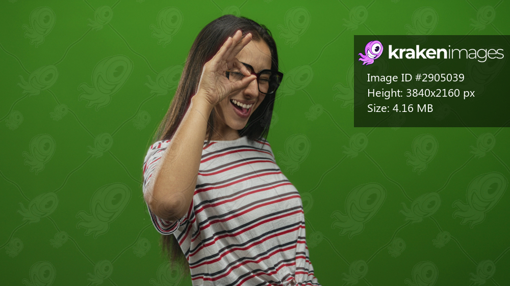 Woman in striped shirt wearing glasses making ok sign and smiling in studio with green wall; playful joyful confidence.