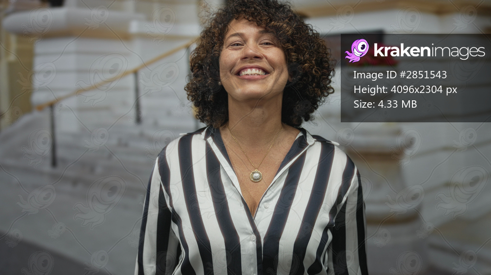Woman in striped shirt wearing gold pendant smiling with finger pointing to head on street; idea happiness.