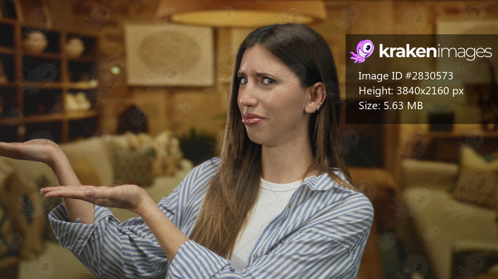 Woman in striped shirt and white top holds out bare palms toward camera in cozy studio with sofa and warm lamp lighting; uncertainty.
