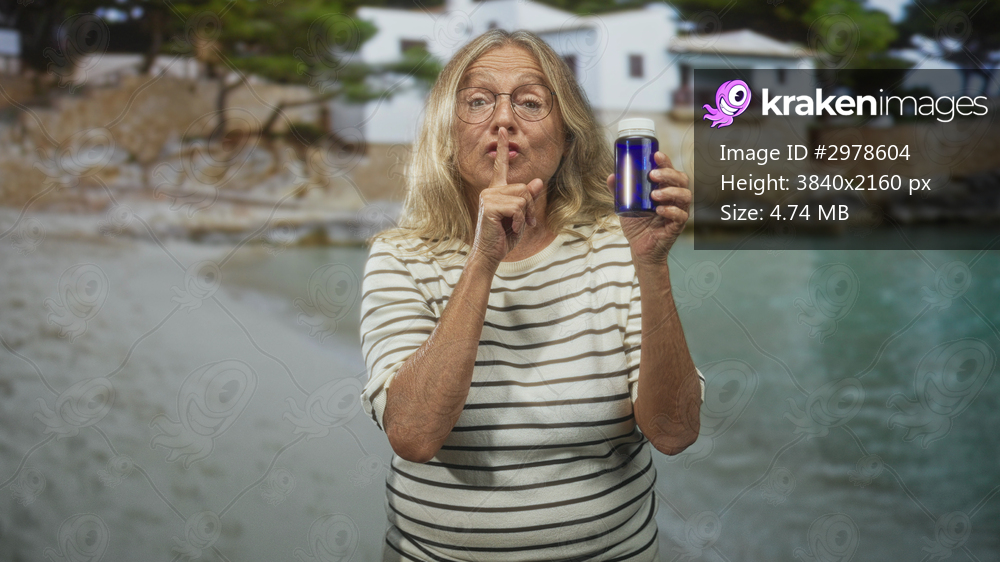 Woman in striped sweater and glasses holding blue pill bottle, finger to lips shushing gesture at building by the beach; quiet reassurance comfort.