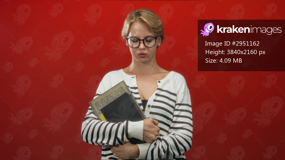 Woman in striped sweater holding ornate hardcover and black notebook to chest in red studio while hugging books and wearing glasses; quiet contemplation. - Kraken Images