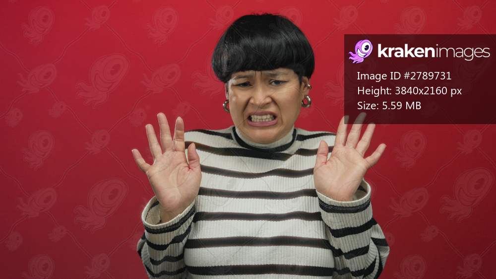 Woman in striped sweater making disgusted face over red background, hands raised as if to ward off something unpleasant, showcasing emotion vividly.
