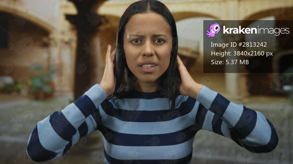 Woman in striped sweater standing in old town courtyard displaying a range of expressive gestures.