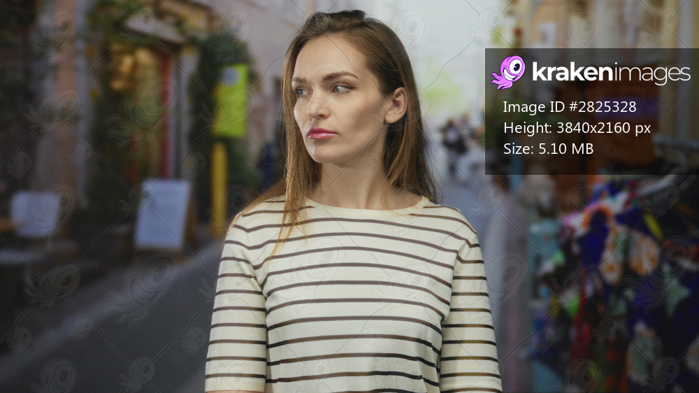 Woman in striped sweater stands with closed eyes and glances sideways on crowded street; calm reflection.