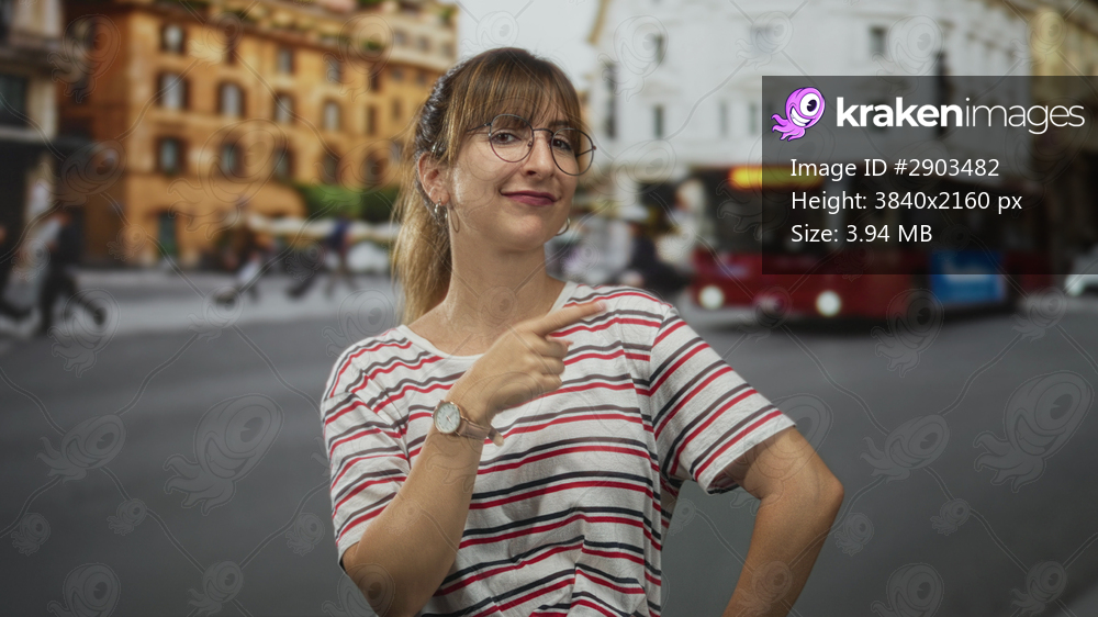 Woman in striped t shirt and glasses giving thumbs up gesture on a busy city street with a red bus and blurred pedestrians; approval.
