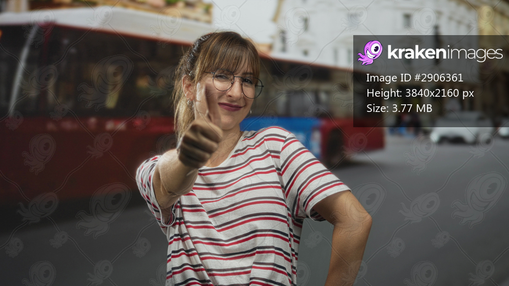 Woman in striped t shirt and glasses giving thumbs up gesture on a busy city street with a red bus and blurred pedestrians; approval.