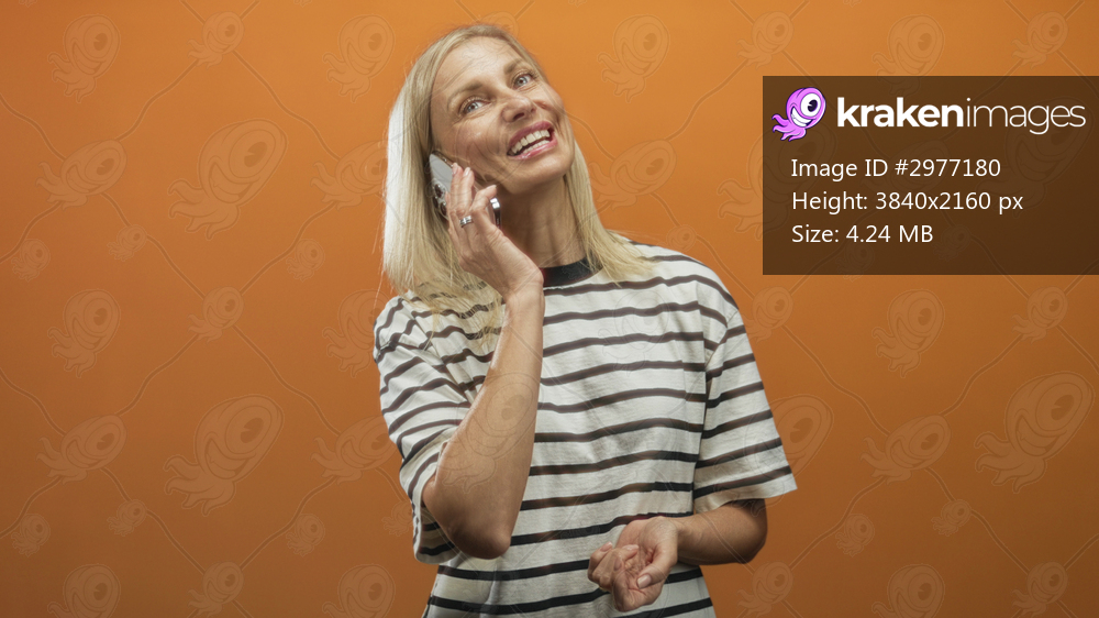 Woman in striped t shirt holding smartphone to ear making a grimace in studio orange backdrop with rings visible on hand; frustration.