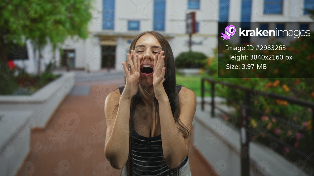 Woman in striped tank top cupping hands to shout while standing on a building walkway beside a bus and metal railing with flowering beds; urgency.