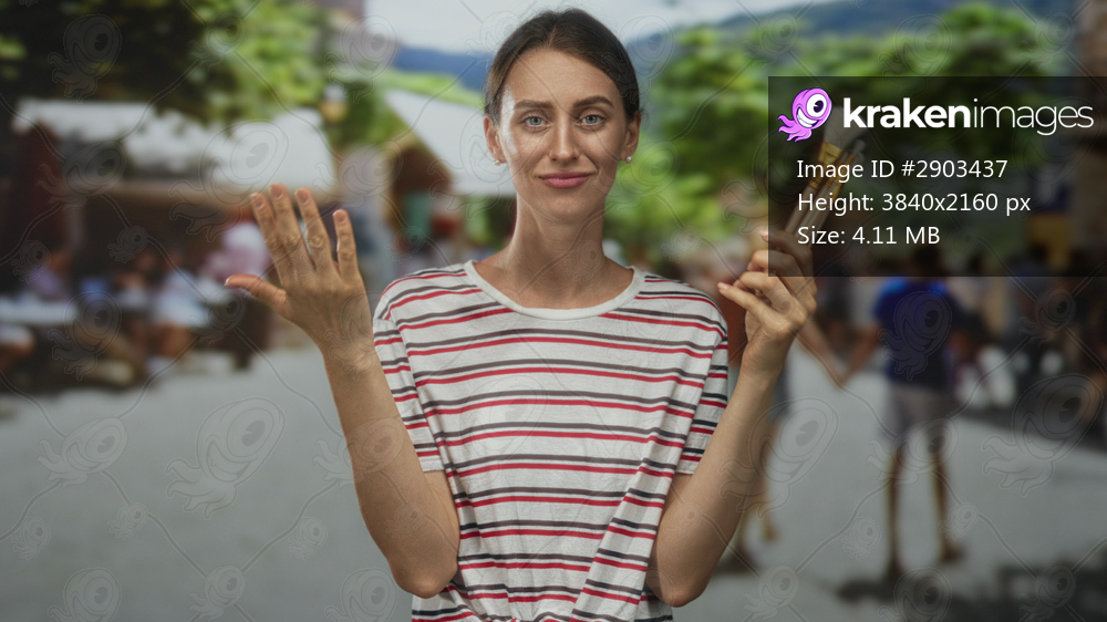 Woman in striped tee holds paintbrushes in right hand and raises left open palm on crowded street market; creative uncertainty.