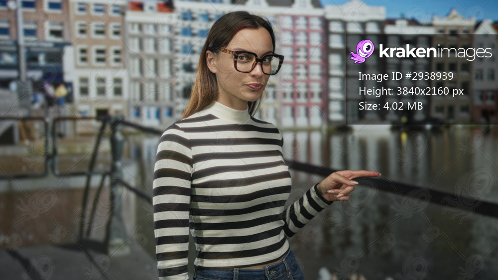 Woman in striped top with glasses finger pointing to the right on a street canal railing in amsterdam; confidence.