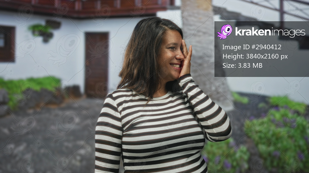 Woman in striped top with hand on cheek smiling in a white courtyard building with wooden door and stairs visible; warm happiness.