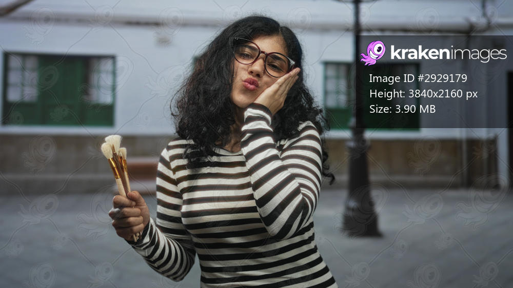 Woman in striped top wearing glasses holding makeup brushes on a cobbled street blowing a kiss to camera; playful affection.