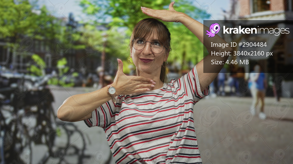 Woman in striped tshirt and glasses frames her face with both hands on a busy city street with bicycles and storefronts visible; playful joy.