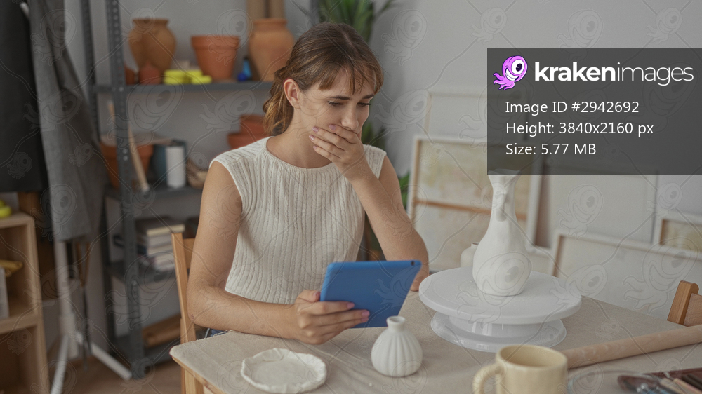 Woman in studio holding blue tablet with hand covering mouth near pottery wheel and clay vase on table; quiet contemplation.