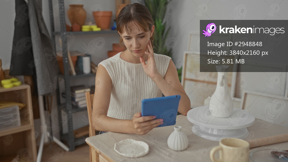 Woman in studio holding blue tablet with hand covering mouth near pottery wheel and clay vase on table; quiet contemplation.