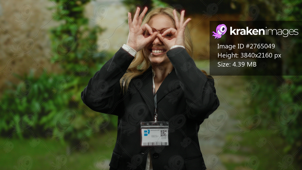 Woman in suit with id badge gestures playfully in a vibrant park setting surrounded by green trees.