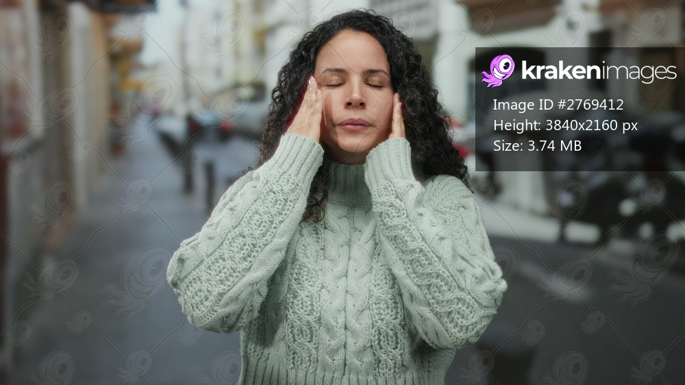 Woman in sweater outdoors on street with hand on forehead appears stressed, reflecting emotion in urban setting during daytime.