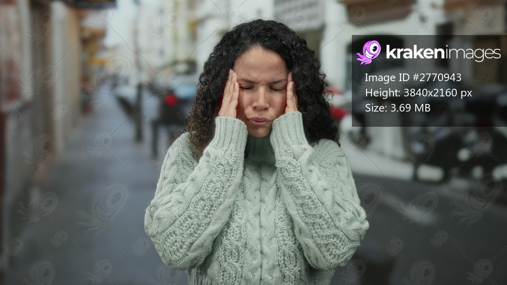 Woman in sweater outdoors on street with hand on forehead appears stressed, reflecting emotion in urban setting during daytime.