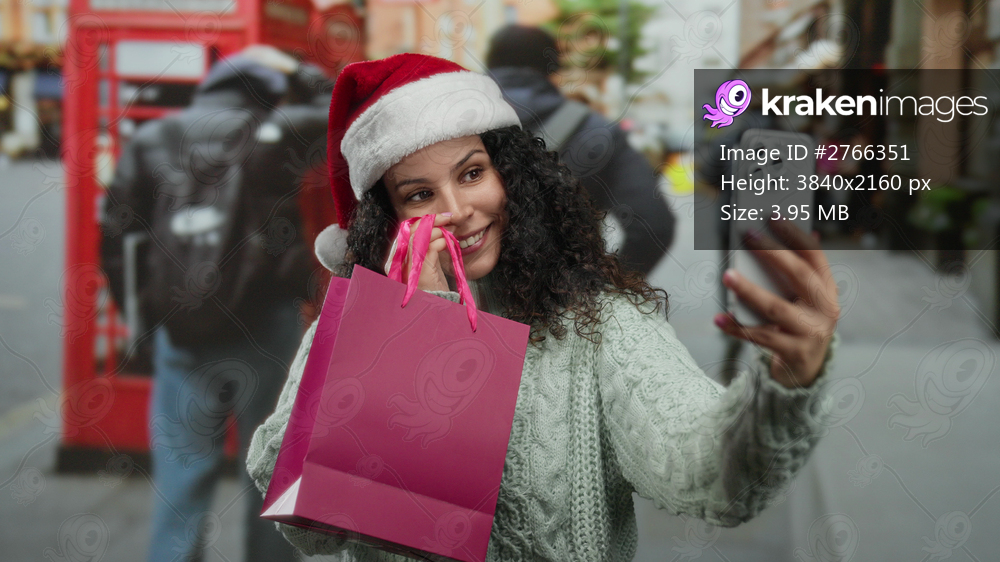 Woman in sweater and santa hat taking selfie with pink gift bag on busy street near red phone booth during festive shopping season in city