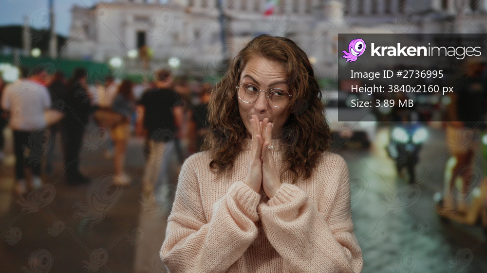 Woman in sweater stands on busy city street at night, surrounded by people and traffic, captures urban lifestyle with expressive emotions and vibrant atmosphere. - Kraken Images