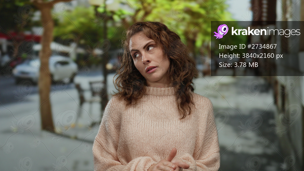 Woman in sweater stands outdoors on urban street with trees and blurred background creating a relaxed city atmosphere under natural light.