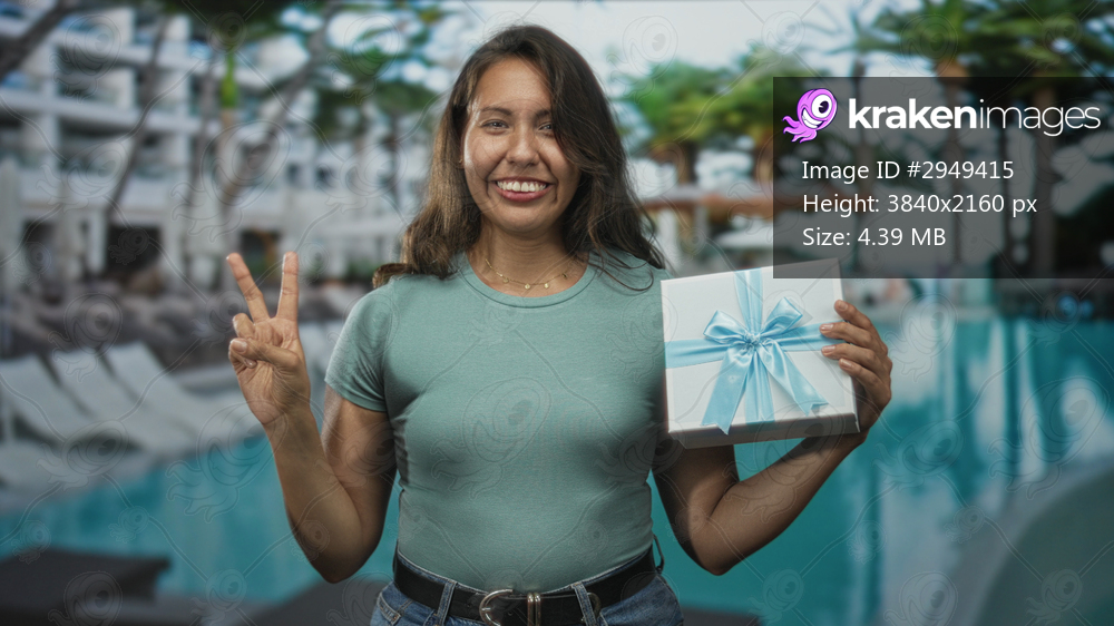 Woman in teal shirt holding wrapped gift box by pool makes peace sign and smiles with casual pose; celebration joy.