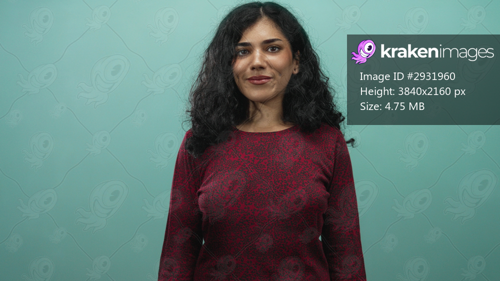 Woman in teal studio, side profile with visible cheek piercings and shoulder, looking sideways; quiet confidence.