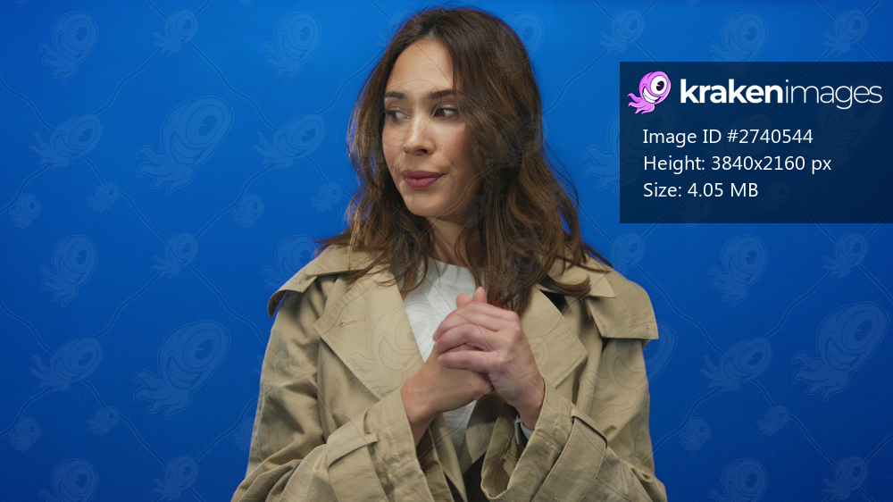 Woman in trench coat over blue background with thoughtful expression isolated and focused, portraying contemplative mood and body language