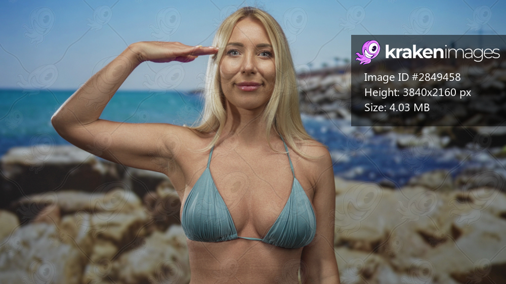 Woman in turquoise bikini salutes head showing bare chest against sunlit rocky seaside street; pride.