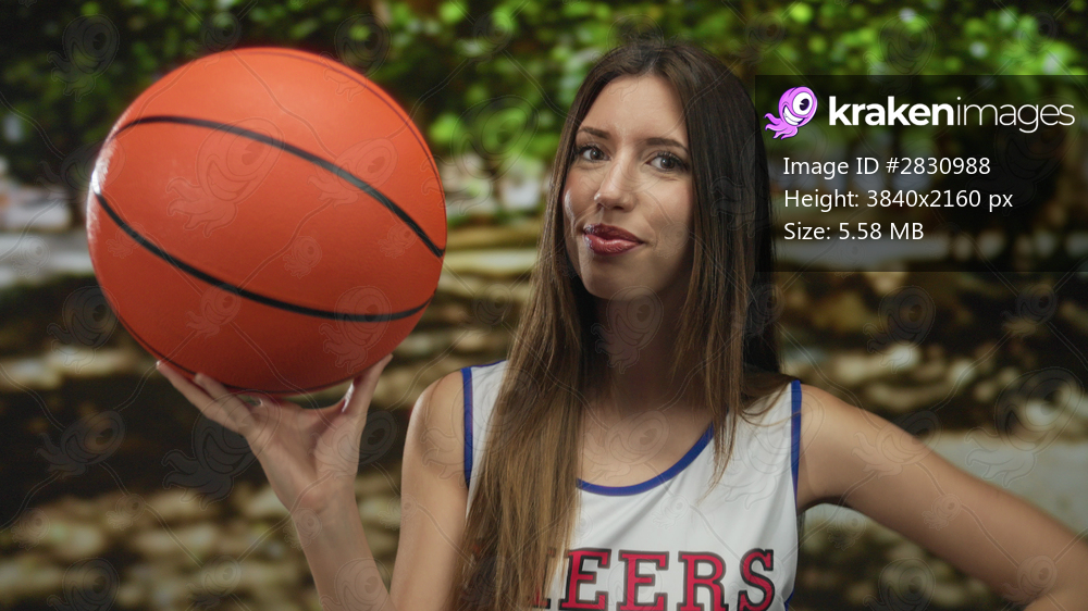 Woman in uniform holds bright orange basketball with fingertips in bright sunlit green park; confidence energy vitality fun.