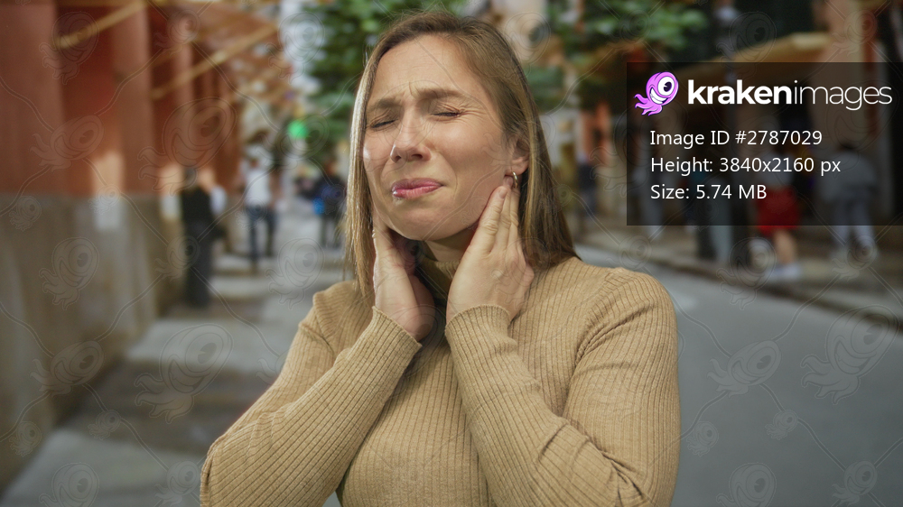 Woman in urban area holds throat with closed eyes expressing discomfort on city street during daytime.