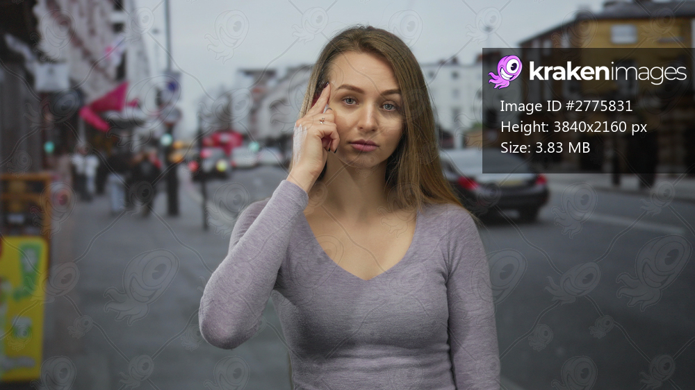 Woman in urban street making gestures suggesting thought or decision, surrounded by cityscape with cars and people, reflecting a contemplative outdoor city setting. - Kraken Images