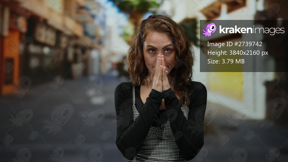 Woman in urban street meditatively clasping hands, expressing peace during daytime in city, showcasing blend of tranquility and urban life