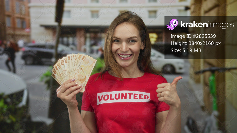 Woman in volunteer shirt displays lira banknotes with bare hand and gives thumb up gesture in street; optimism.
