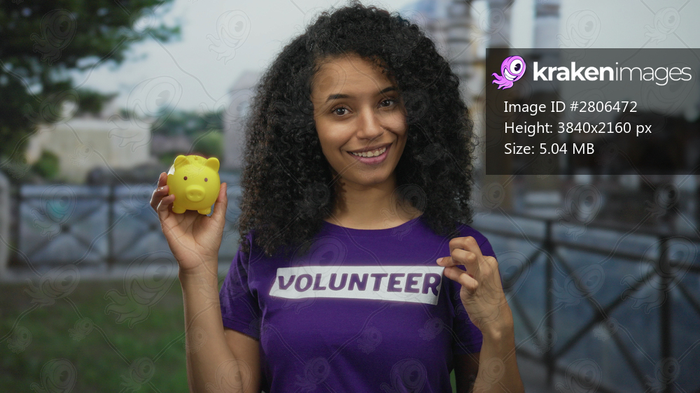 Woman in volunteer shirt holding piggybank smiling on outdoor town street suggesting community support initiative.