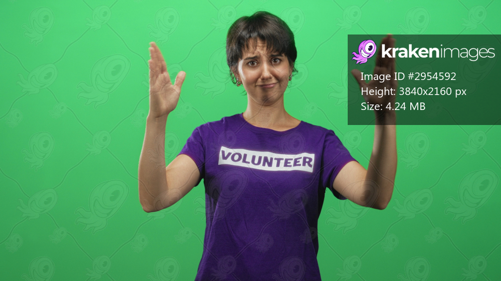 Woman in volunteer shirt raises open hands apart in studio green screen, palms visible and expressive, short hair; bemused empathy.