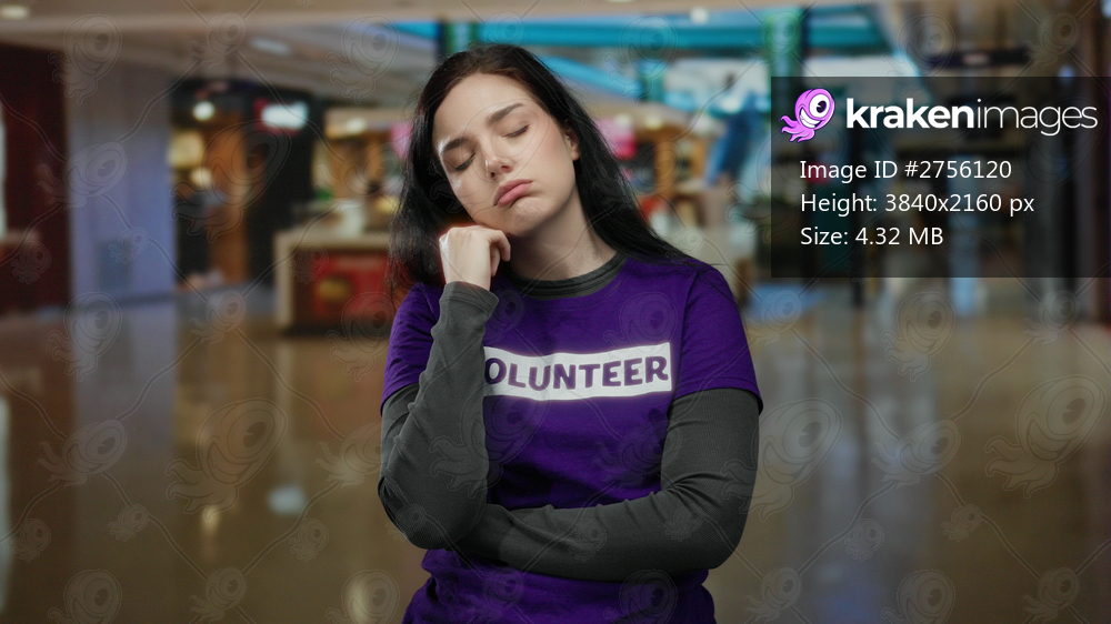Woman in volunteer t-shirt looking tired in a mall environment, capturing the essence of community service dedication and fatigue.