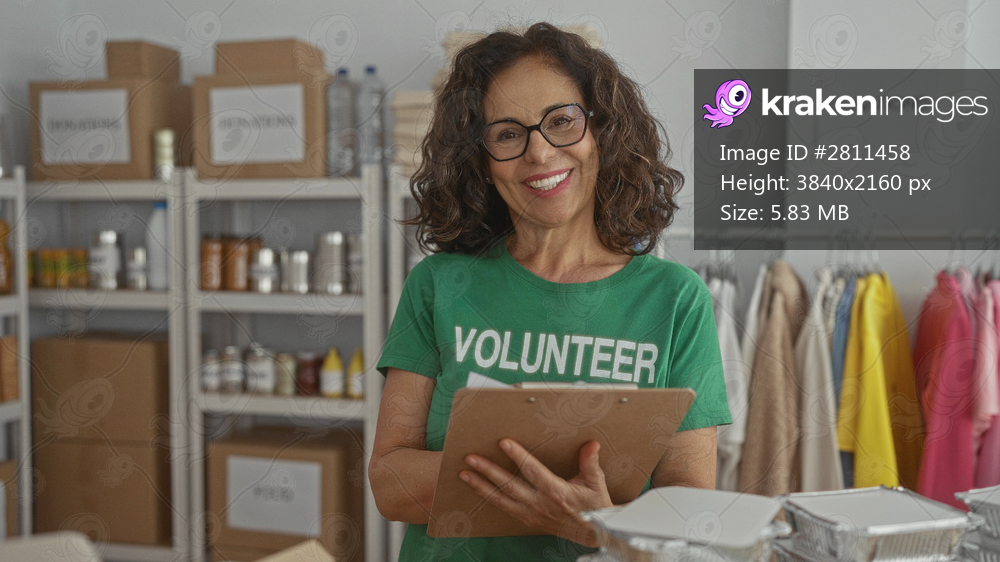Woman in volunteer uniform writing on clipboard in charity room with clothes and food donations shelves.