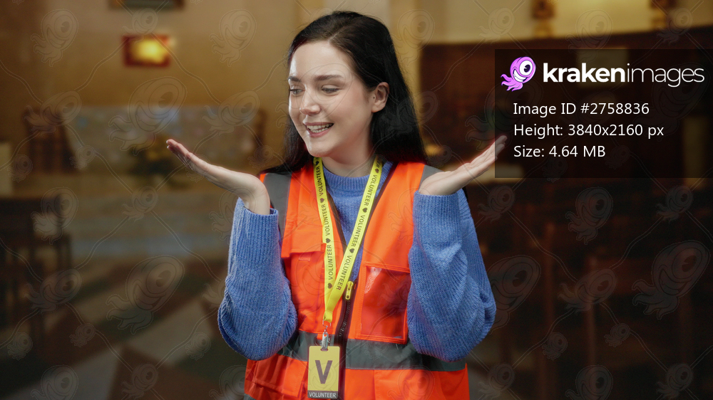 Woman in volunteer vest raises hands in catholic church setting, showcasing expression of uncertainty in a religious environment with wooden chairs and altar in background. - Kraken Images