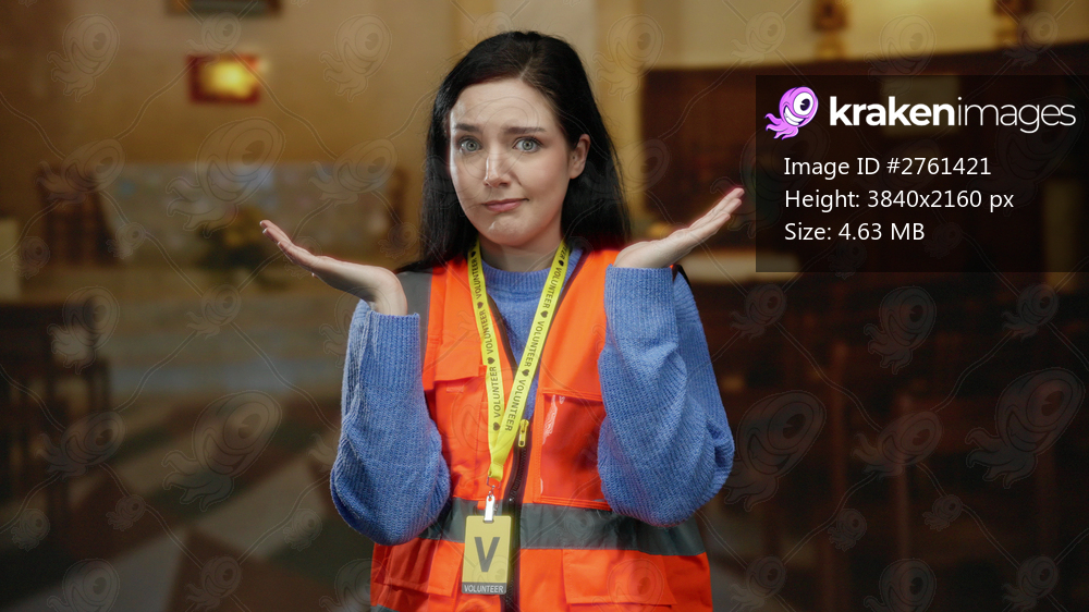 Woman in volunteer vest raises hands in catholic church setting, showcasing expression of uncertainty in a religious environment with wooden chairs and altar in background. - Kraken Images