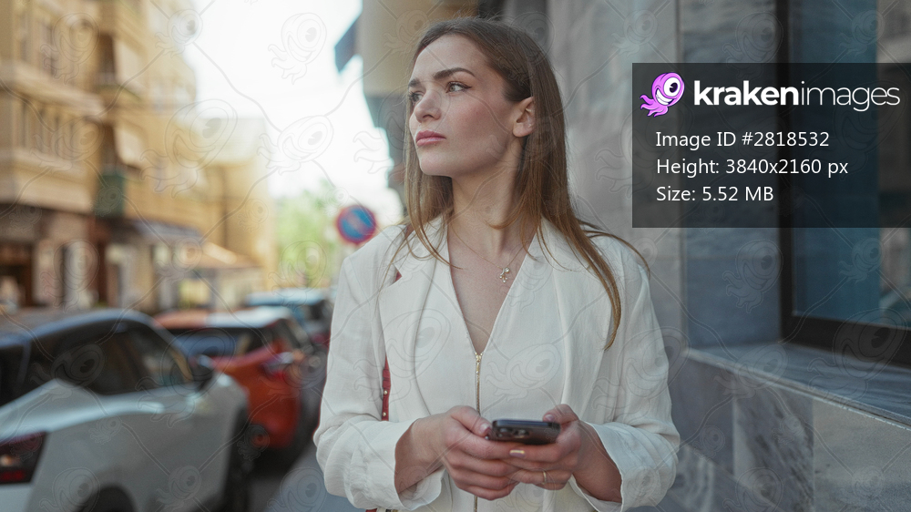 Woman in white blazer holding smartphone in both hands and glancing sideways on city street; curiosity.