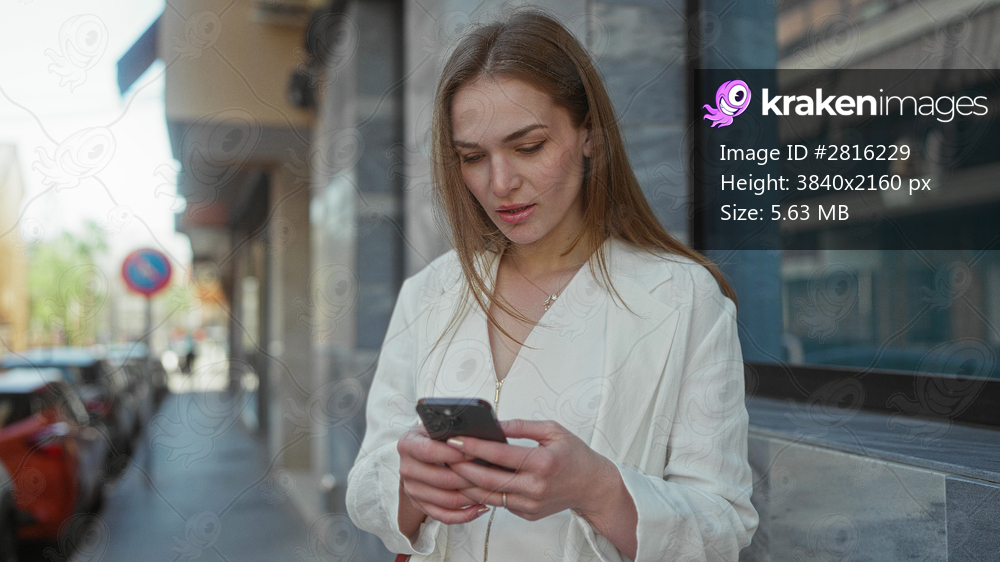 Woman in white blazer touches hair holding smartphone with eyes closed in city street with parked cars; serenity.