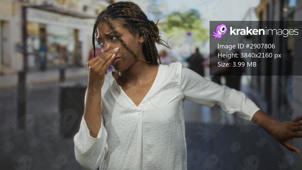 Woman in white blouse with braided hair pinches nose and covers mouth with hand while stepping on a busy city street among blurred pedestrians; disgust. - Kraken Images
