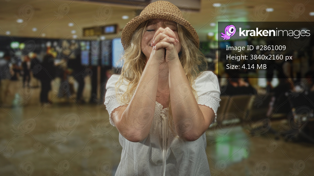 Woman in white blouse and brimmed straw hat pleading with hands clasped at chest in busy airport terminal near gates; desperation.