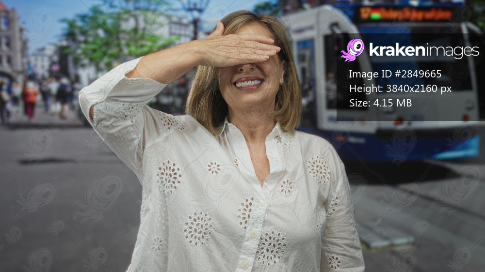 Woman in white blouse covers her eyes with her hand in front of a moving tram on a busy city street; joy.