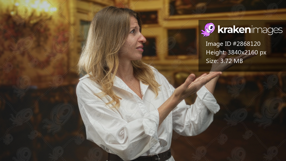 Woman in white blouse gesturing with open palms raised amid framed paintings in ornate building gallery; art discussion concern.