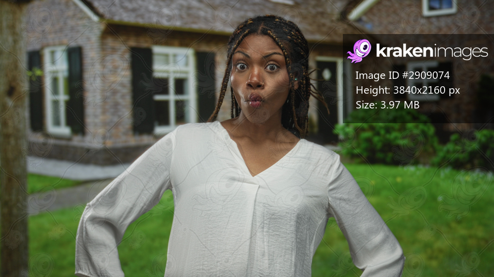 Woman in white blouse with hands on hips puckers lips at building entrance by house doorway; playful defiance neighborhood humor.