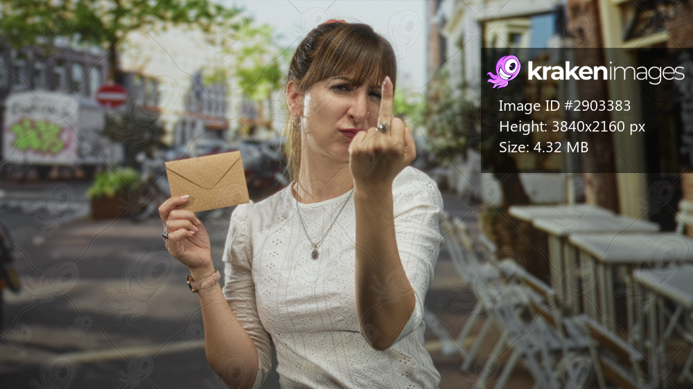 Woman in white blouse holding brown envelope shows middle finger on street outside cafe building; defiance rebellion.